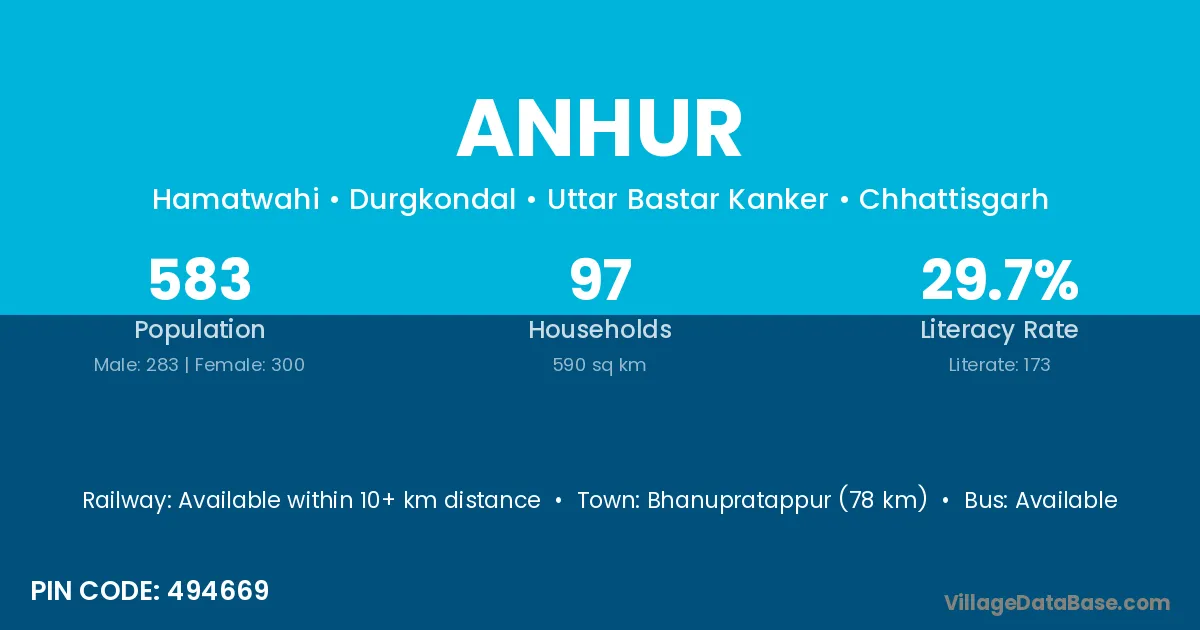 Bhanupratappur (78 km) is the nearest town to Anhur village for major economic activities and is located approximately 78 km away.
