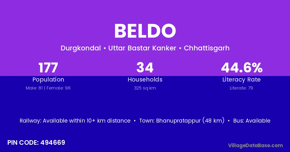 Bhanupratappur (48 km) is the nearest town to Beldo village for major economic activities and is located approximately 48 km away.