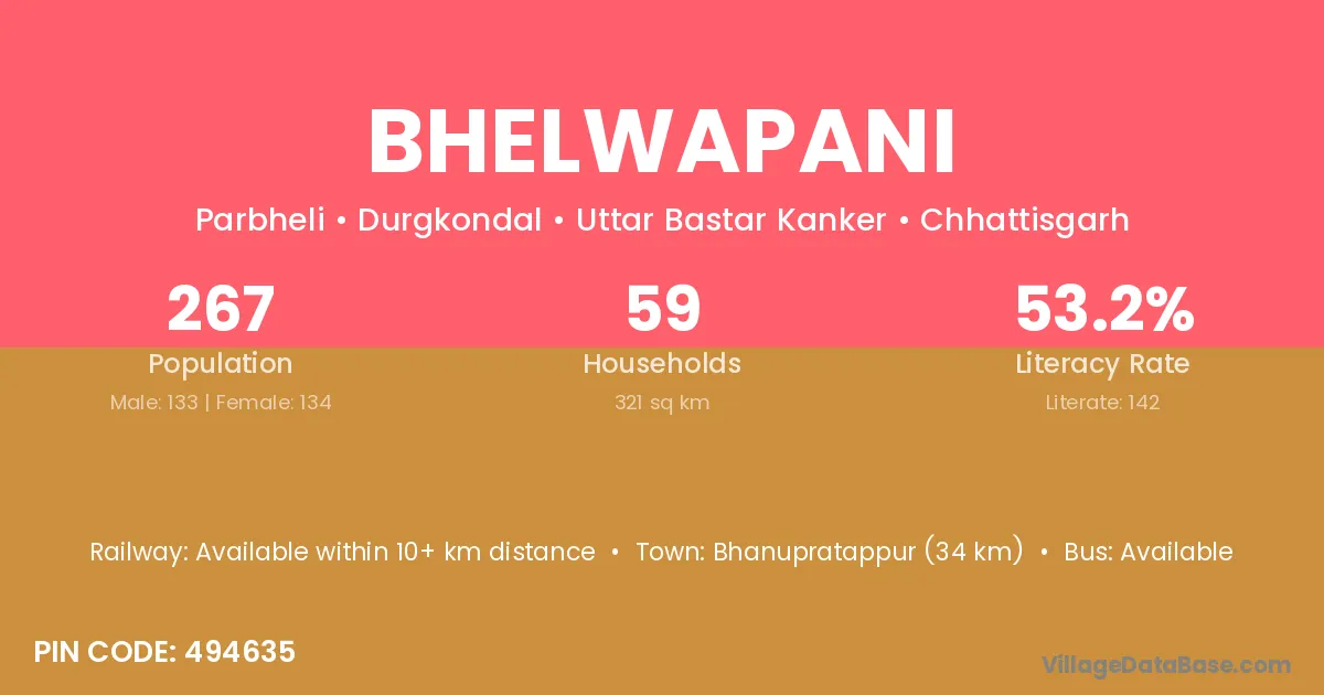 Bhelwapani village has a total population of 267 people, of which 133 are males and 134 are females.