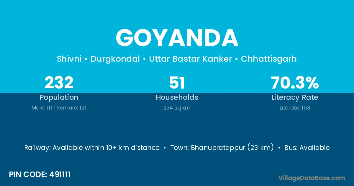 Bhanupratappur (23 km) is the nearest town to Goyanda village for major economic activities and is located approximately 23 km away.