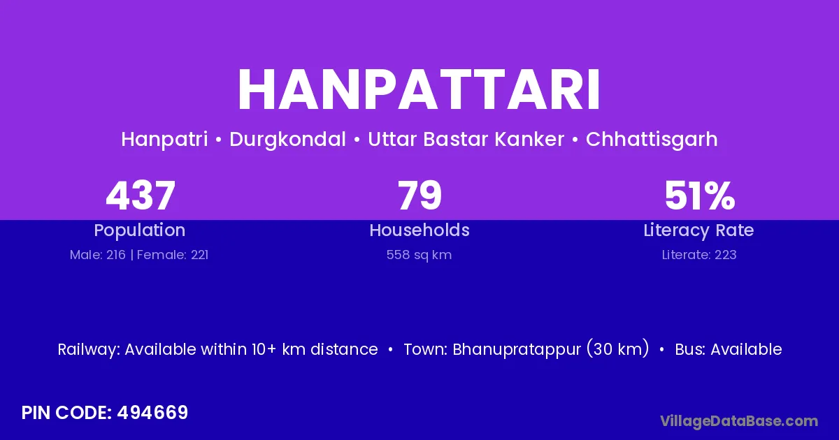 Bhanupratappur (30 km) is the nearest town to Hanpattari village for major economic activities and is located approximately 30 km away.