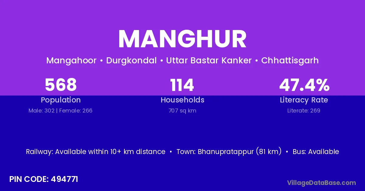 Bhanupratappur (81 km) is the nearest town to Manghur village for major economic activities and is located approximately 81 km away.