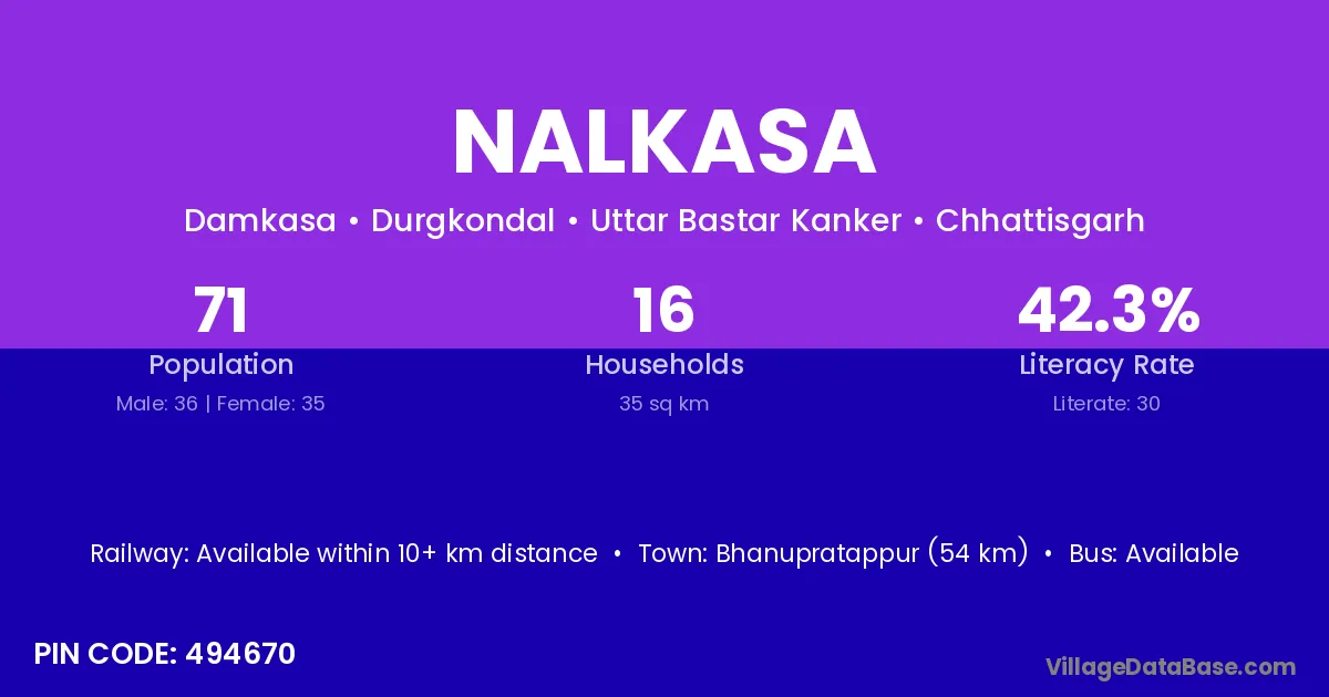 Bhanupratappur (54 km) is the nearest town to Nalkasa village for major economic activities and is located approximately 54 km away.