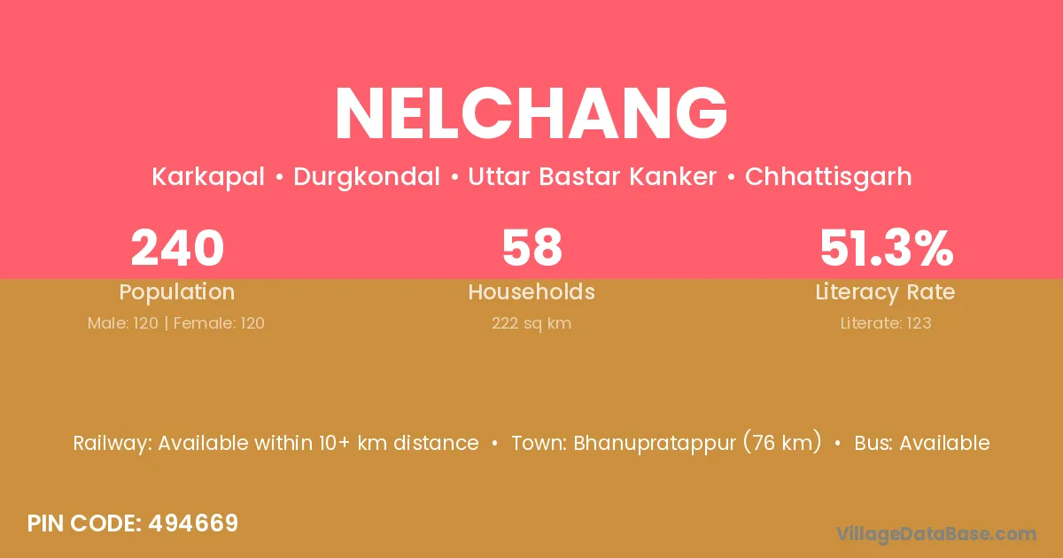 Bhanupratappur (76 km) is the nearest town to Nelchang village for major economic activities and is located approximately 76 km away.