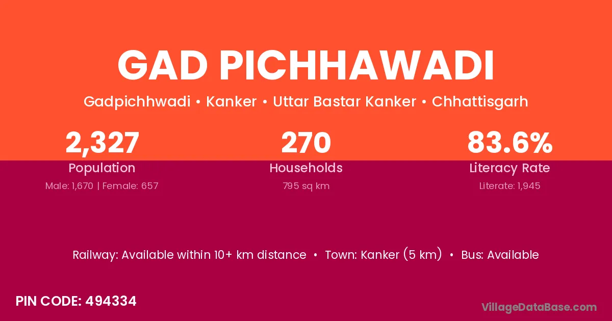Kanker (5 km) is the nearest town to Gad Pichhawadi village for major economic activities and is located approximately 5 km away.