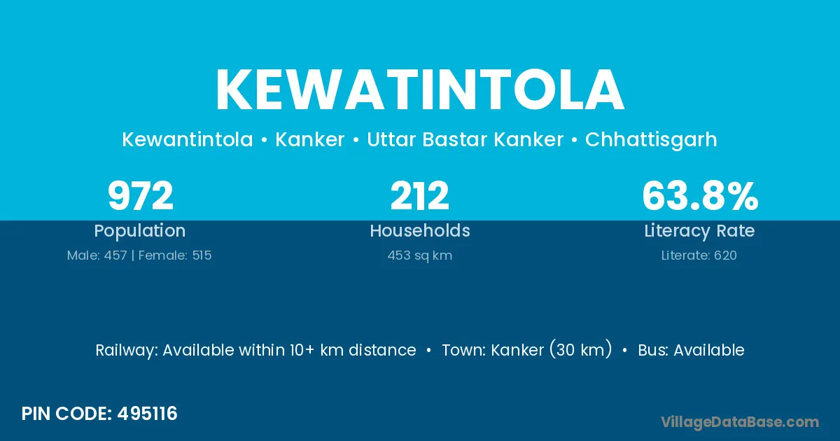 Kanker (30 km) is the nearest town to Kewatintola village for major economic activities and is located approximately 30 km away.