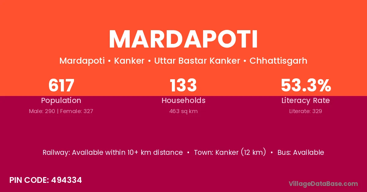 Kanker (12 km) is the nearest town to Mardapoti village for major economic activities and is located approximately 12 km away.