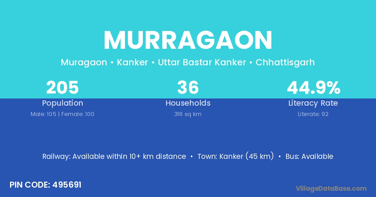 Kanker (45 km) is the nearest town to Murragaon village for major economic activities and is located approximately 45 km away.