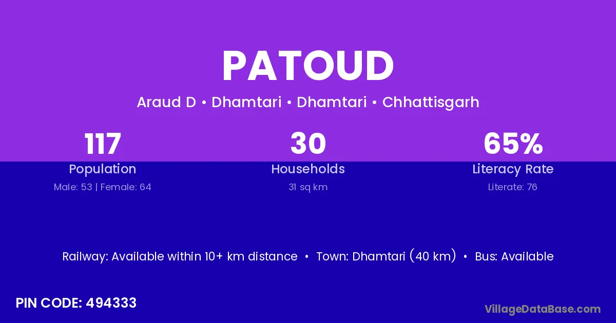 According to Census 2011 information, the village code of Patoud village is 494333.