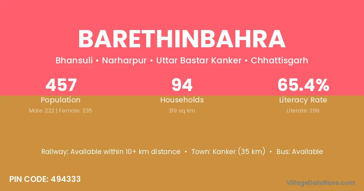 Kanker (35 km) is the nearest town to Barethinbahra village for major economic activities and is located approximately 35 km away.