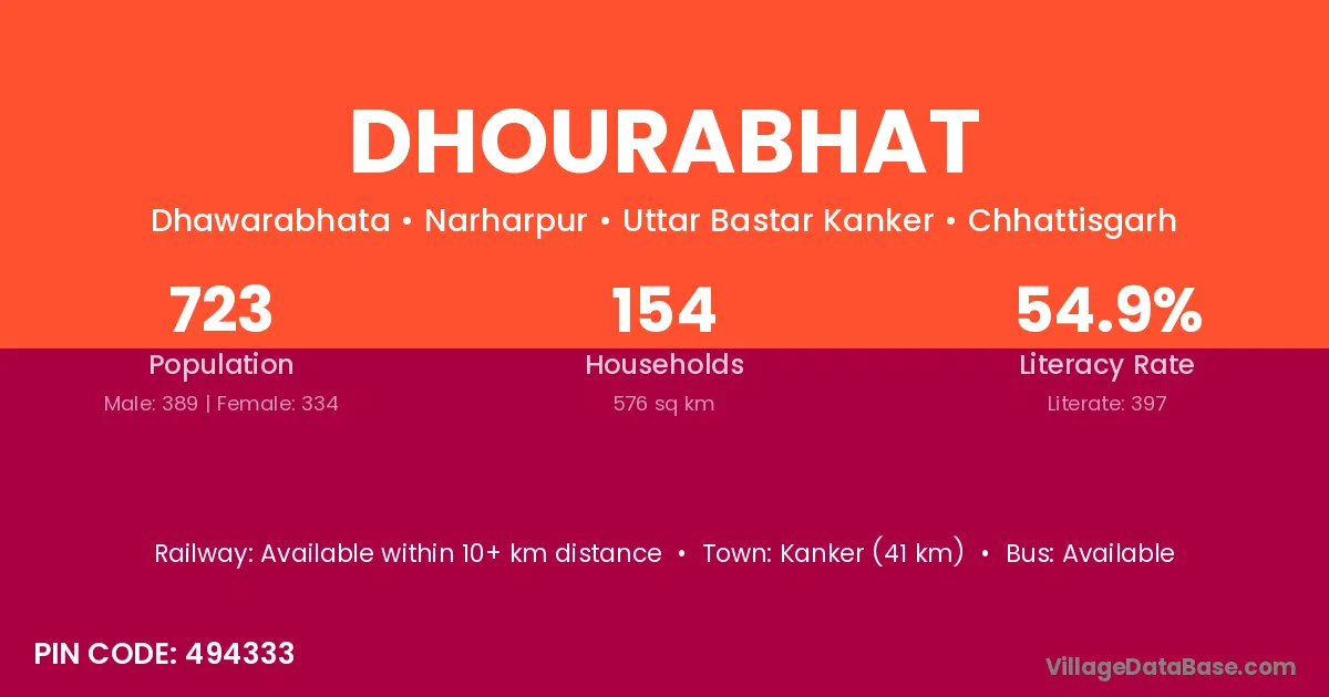 Kanker (41 km) is the nearest town to Dhourabhat village for major economic activities and is located approximately 41 km away.