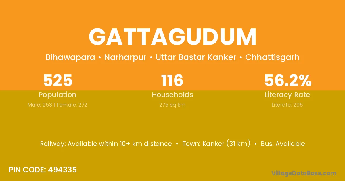 Kanker (31 km) is the nearest town to Gattagudum village for major economic activities and is located approximately 31 km away.