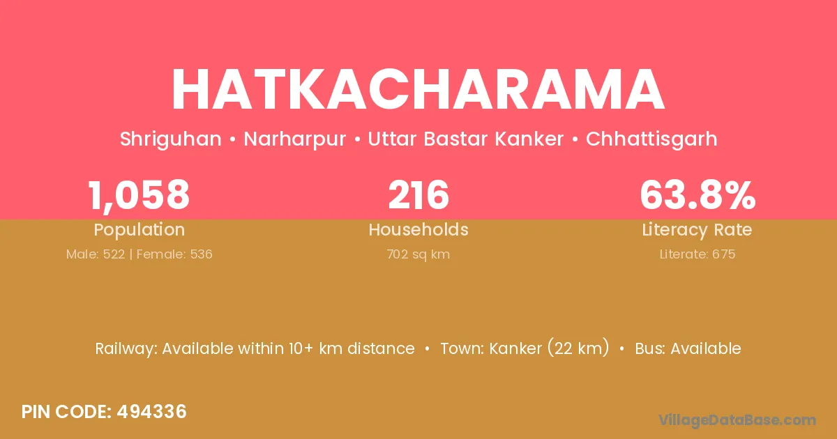 Kanker (22 km) is the nearest town to Hatkacharama village for major economic activities and is located approximately 22 km away.