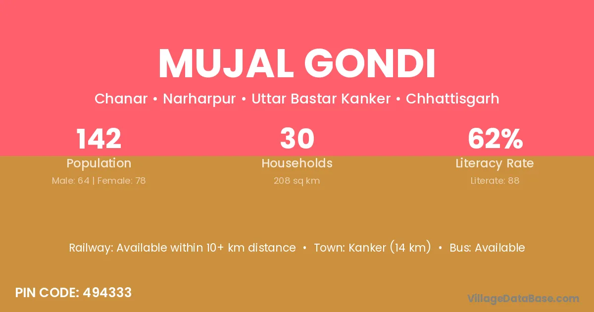Kanker (14 km) is the nearest town to Mujal Gondi village for major economic activities and is located approximately 14 km away.