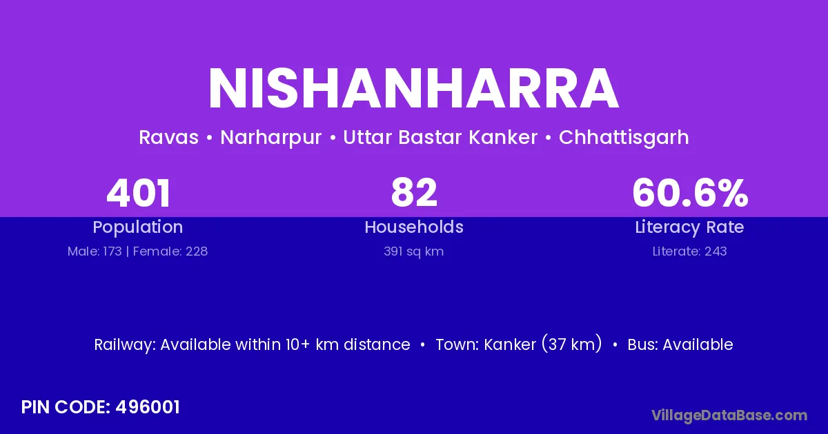 Kanker (37 km) is the nearest town to Nishanharra village for major economic activities and is located approximately 37 km away.