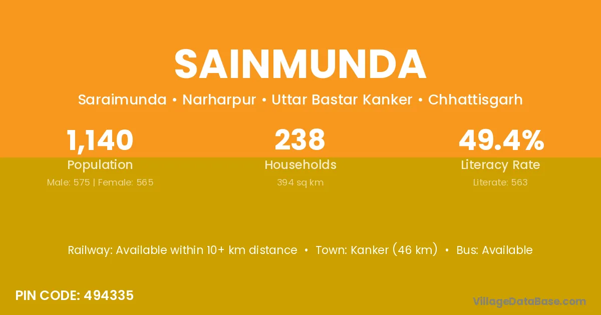 Kanker (46 km) is the nearest town to Sainmunda village for major economic activities and is located approximately 46 km away.