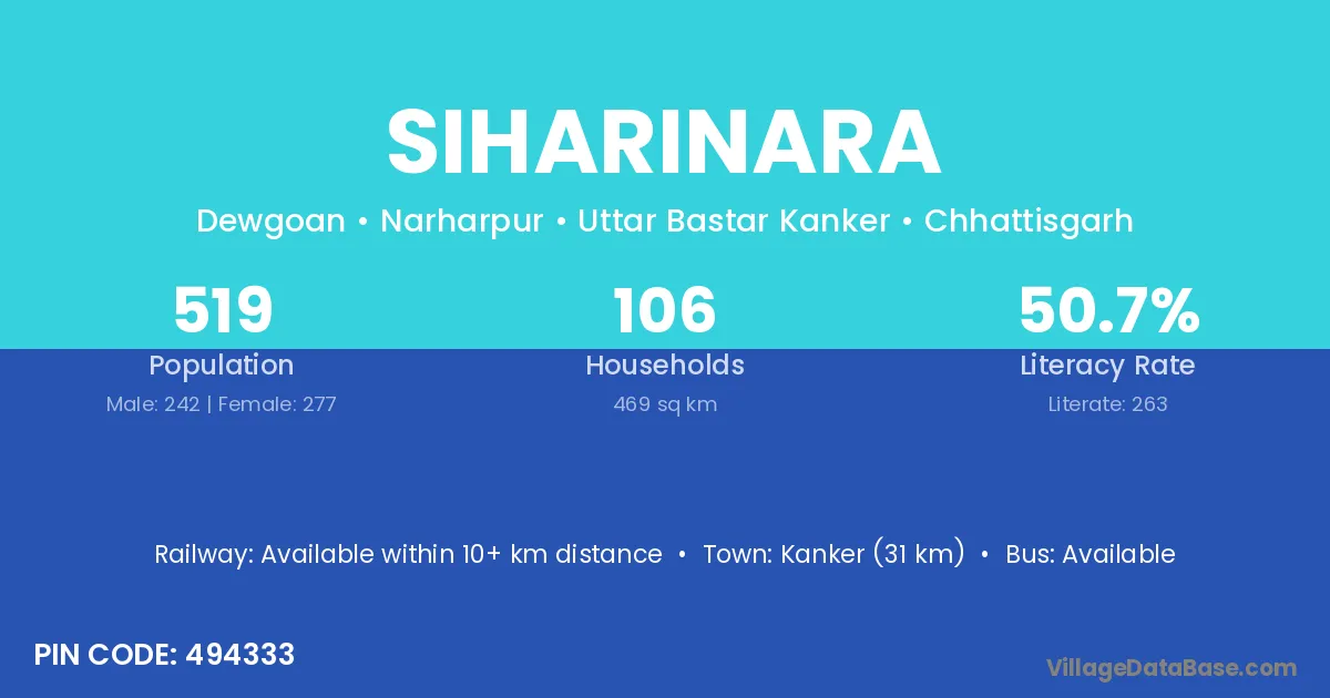 Kanker (31 km) is the nearest town to Siharinara village for major economic activities and is located approximately 31 km away.