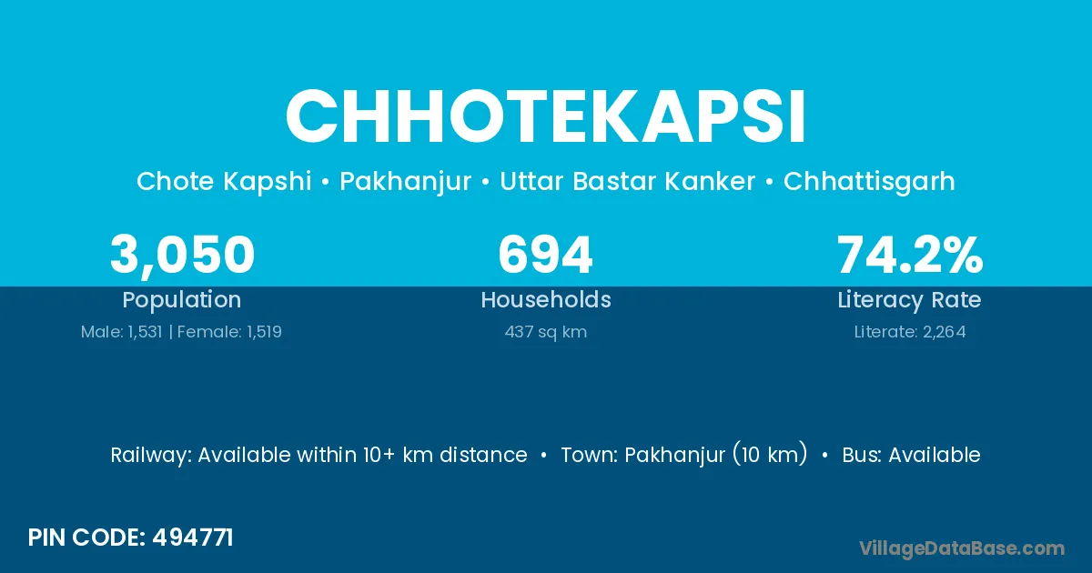 Chhotekapsi village has a total population of 3,050 people, of which 1,531 are males and 1,519 are females.