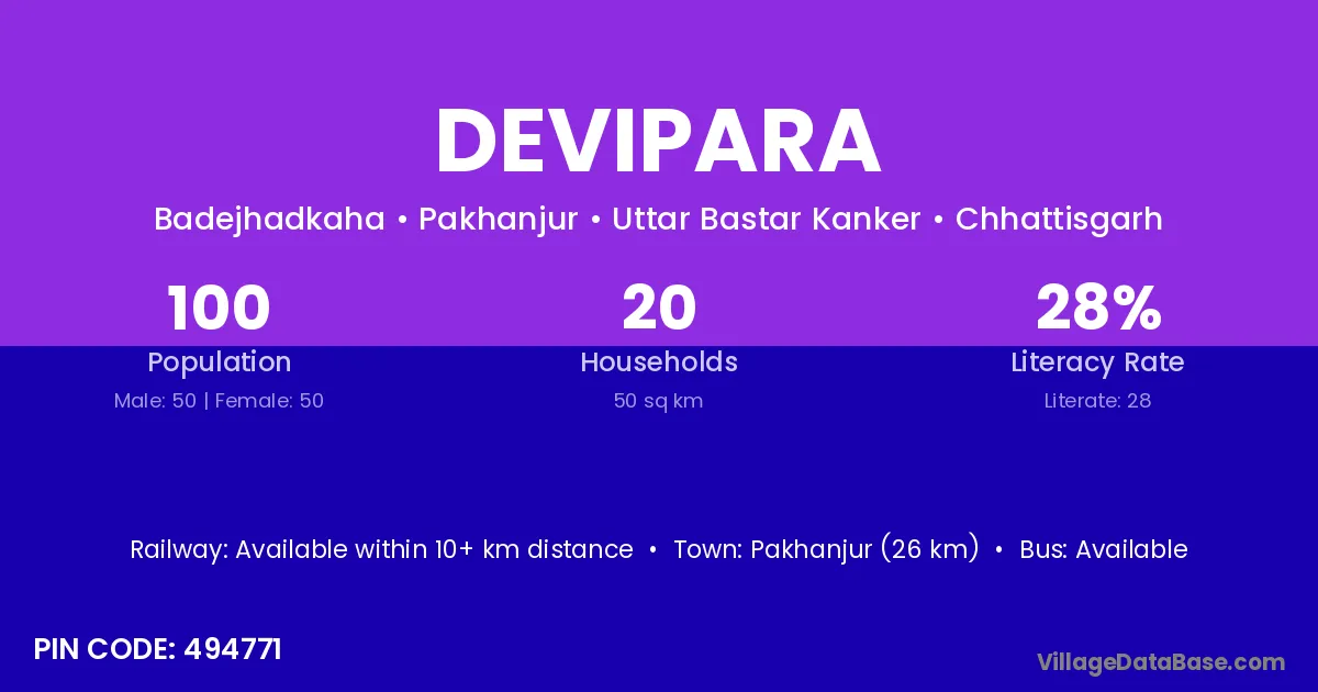Devipara village has a total population of 100 people, of which 50 are males and 50 are females.
