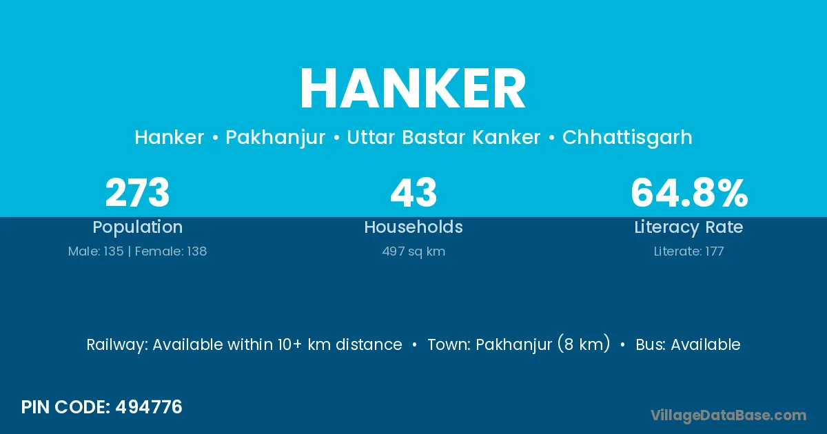 Pakhanjur (8 km) is the nearest town to Hanker village for major economic activities and is located approximately 8 km away.