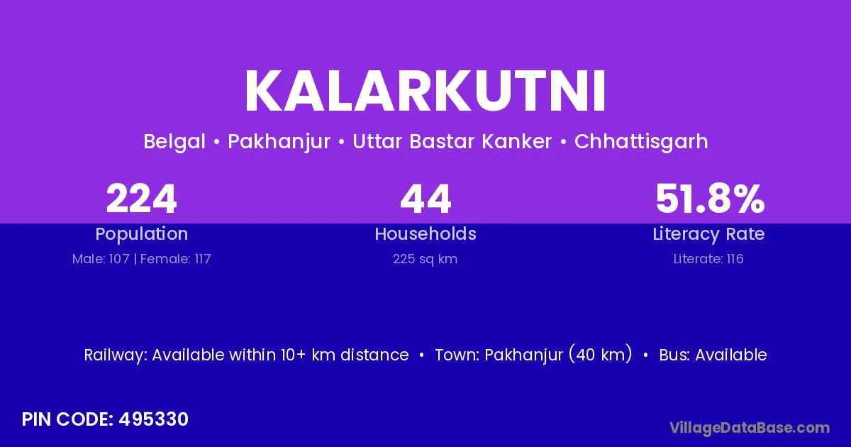 Pakhanjur (40 km) is the nearest town to Kalarkutni village for major economic activities and is located approximately 40 km away.