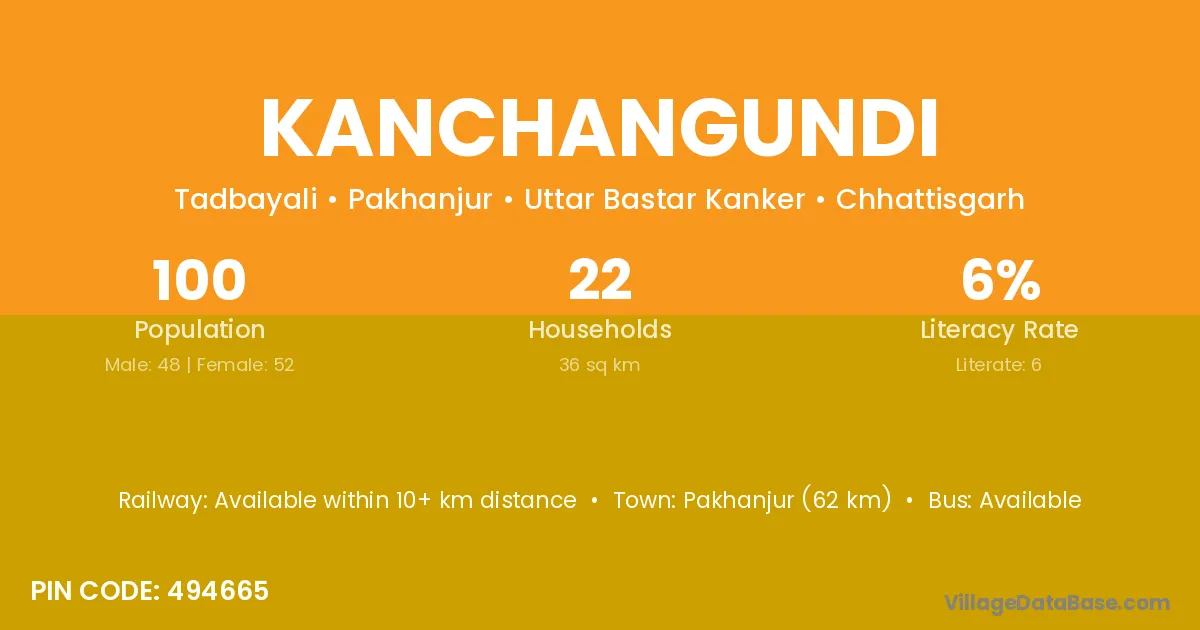 The literacy rate of Kanchangundi village is 6.00%. Male literacy stands at 4.17% and female literacy at 7.69%.
