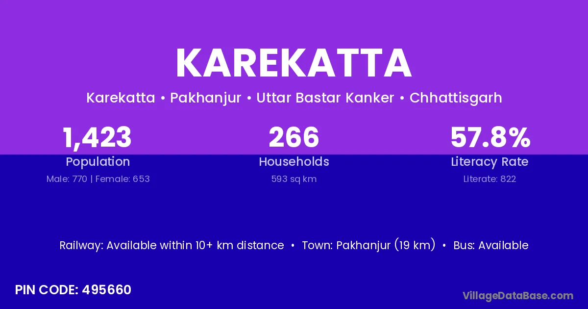 Karekatta village has a total population of 1,423 people, of which 770 are males and 653 are females.