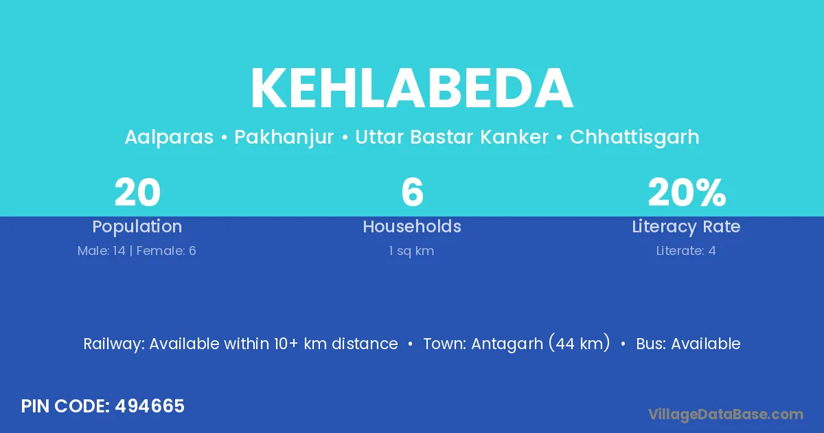 Kehlabeda village has a total population of 20 people, of which 14 are males and 6 are females.