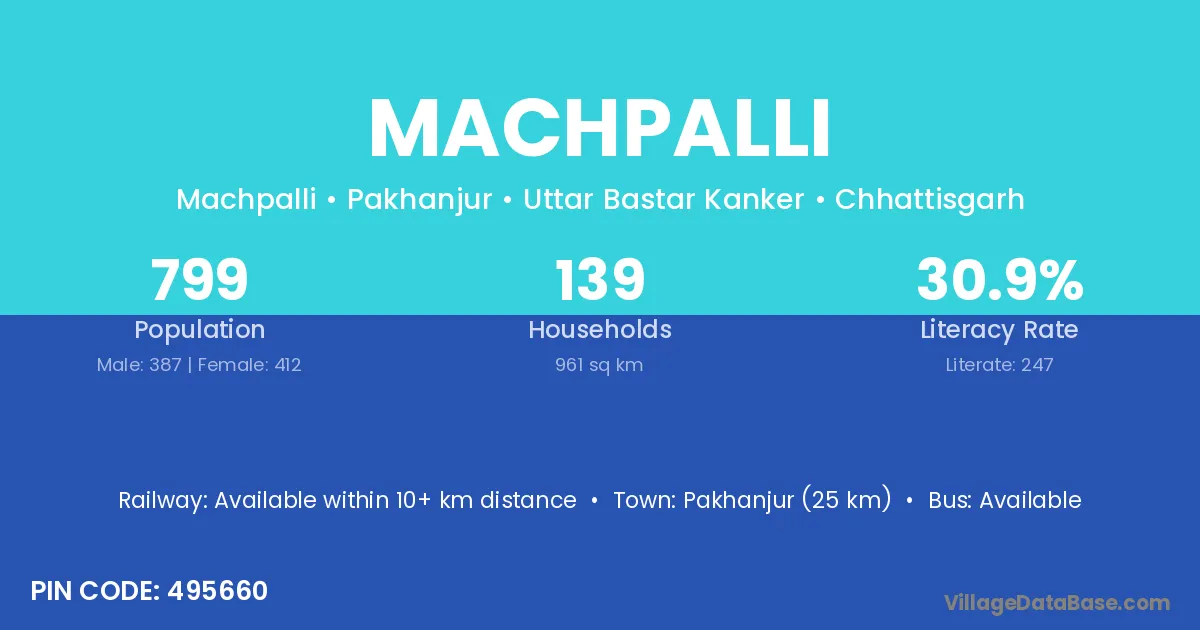 Pakhanjur (25 km) is the nearest town to Machpalli village for major economic activities and is located approximately 25 km away.
