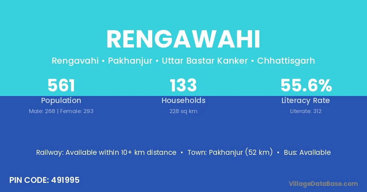 Pakhanjur (52 km) is the nearest town to Rengawahi village for major economic activities and is located approximately 52 km away.