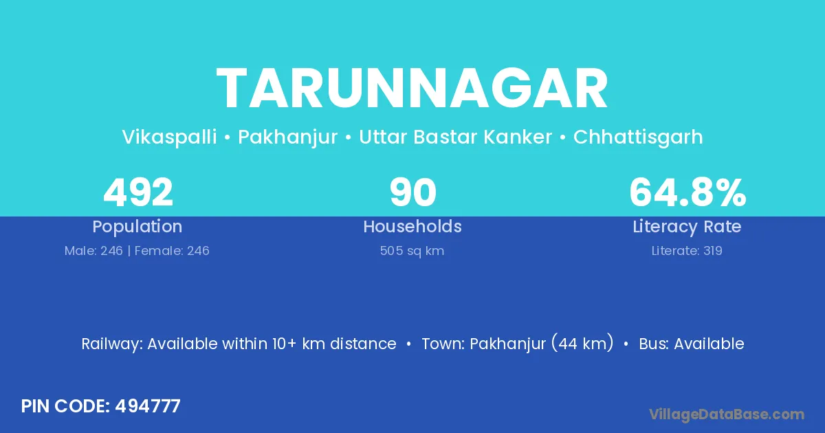 Tarunnagar village has a total population of 492 people, of which 246 are males and 246 are females.