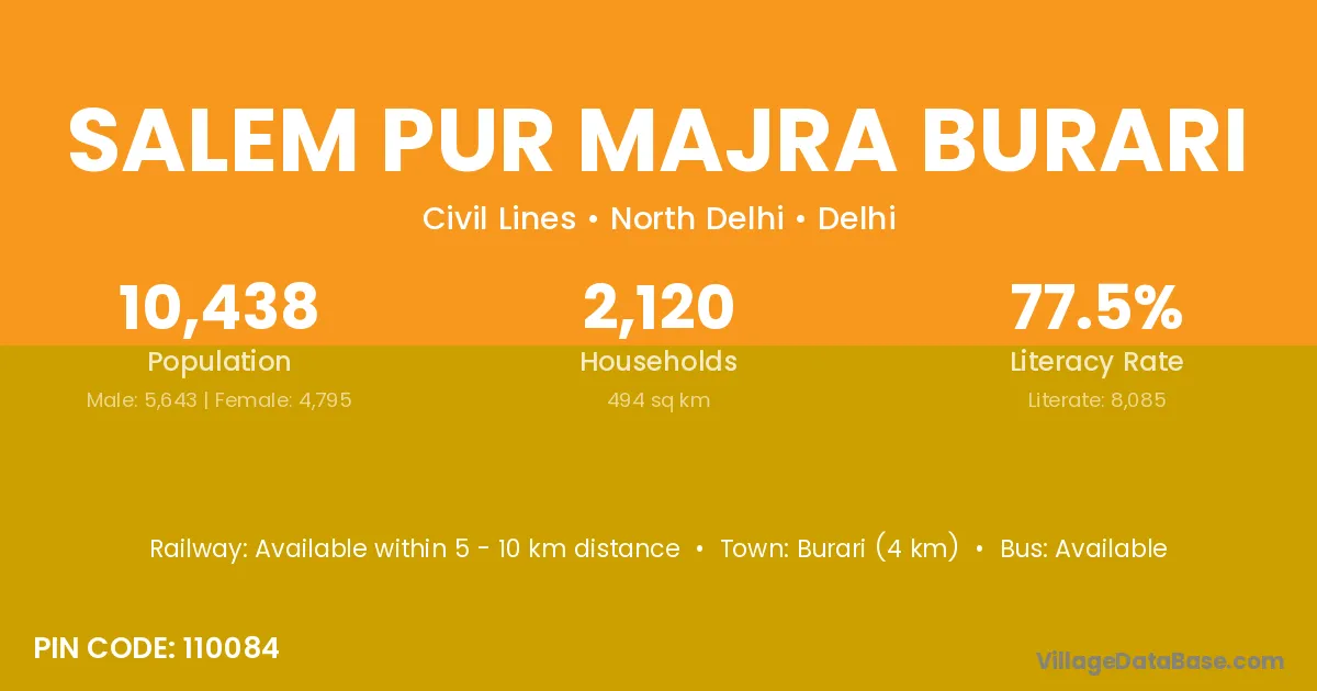 Salem Pur Majra Burari village has a total population of 10,438 people, of which 5,643 are males and 4,795 are females.