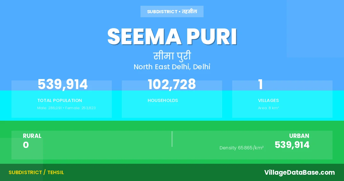 According to the 2011 census The total area of Seema Puri Tehsil is 8 km², with a population of 539914 people. The population density is 65,865 inhabitants per square kilometre, and there are approximately 102728 houses in the sub district.