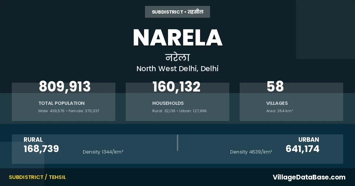 According to the 2011 census The total area of Narela Tehsil is 264 km², with a population of 809913 people. The population density is 3,071 inhabitants per square kilometre, and there are approximately 160132 houses in the sub district.