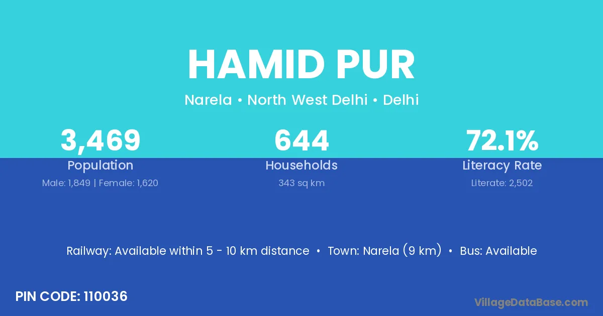 Narela (9 km) is the nearest town to Hamid Pur village for major economic activities and is located approximately 9 km away.
