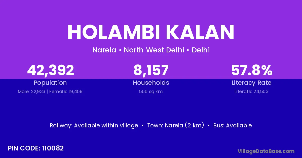 Narela (2 km) is the nearest town to Holambi Kalan village for major economic activities and is located approximately 2 km away.