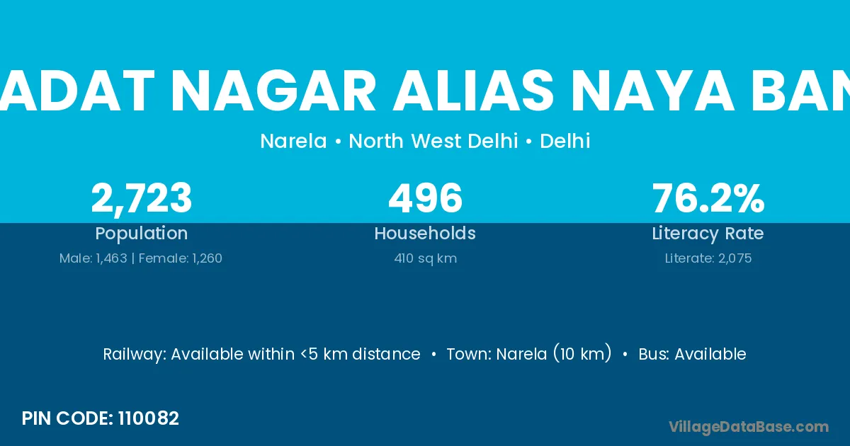 Narela (10 km) is the nearest town to Iradat Nagar Alias Naya Bans village for major economic activities and is located approximately 10 km away.