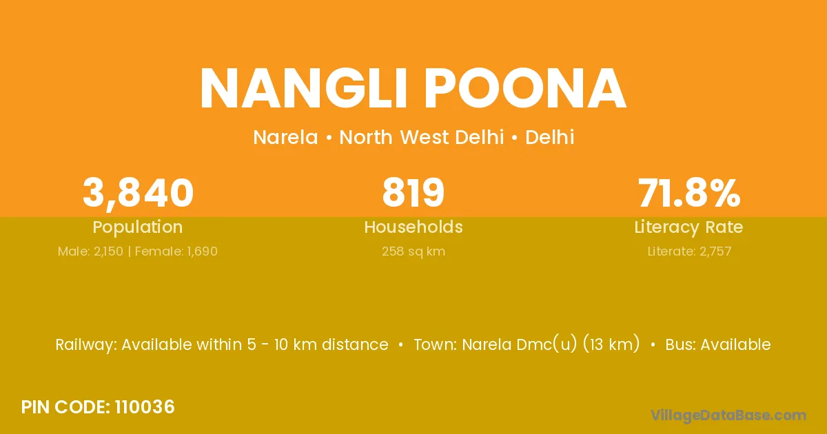 Narela Dmc(u) (13 km) is the nearest town to Nangli Poona village for major economic activities and is located approximately 13 km away.