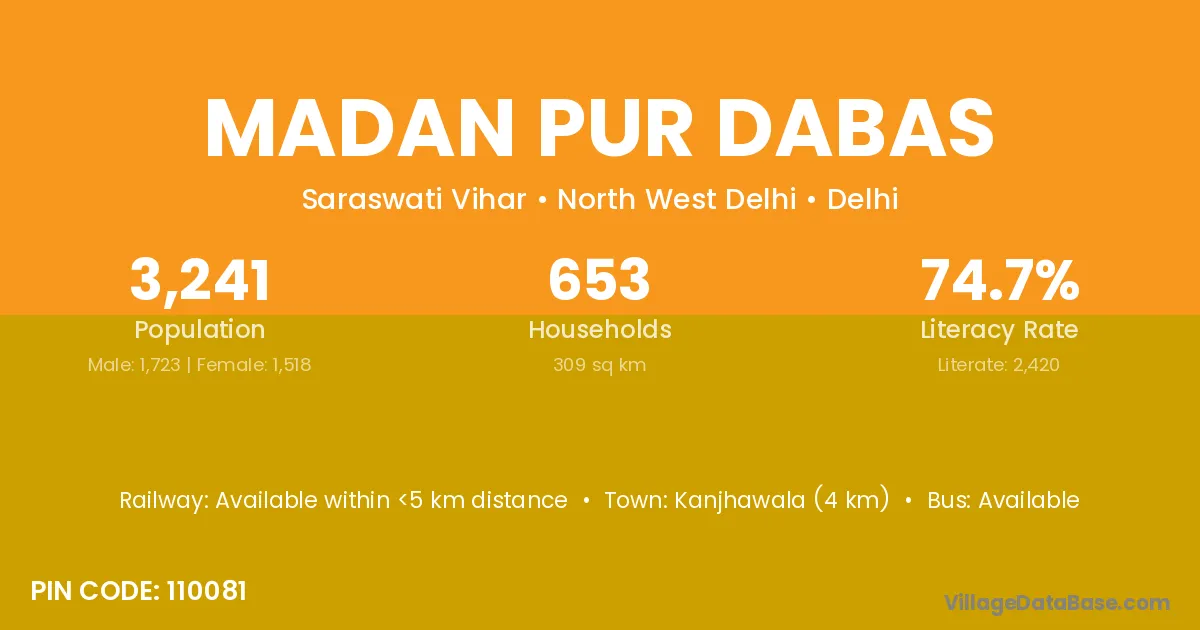 Kanjhawala (4 km) is the nearest town to Madan Pur Dabas village for major economic activities and is located approximately 4 km away.