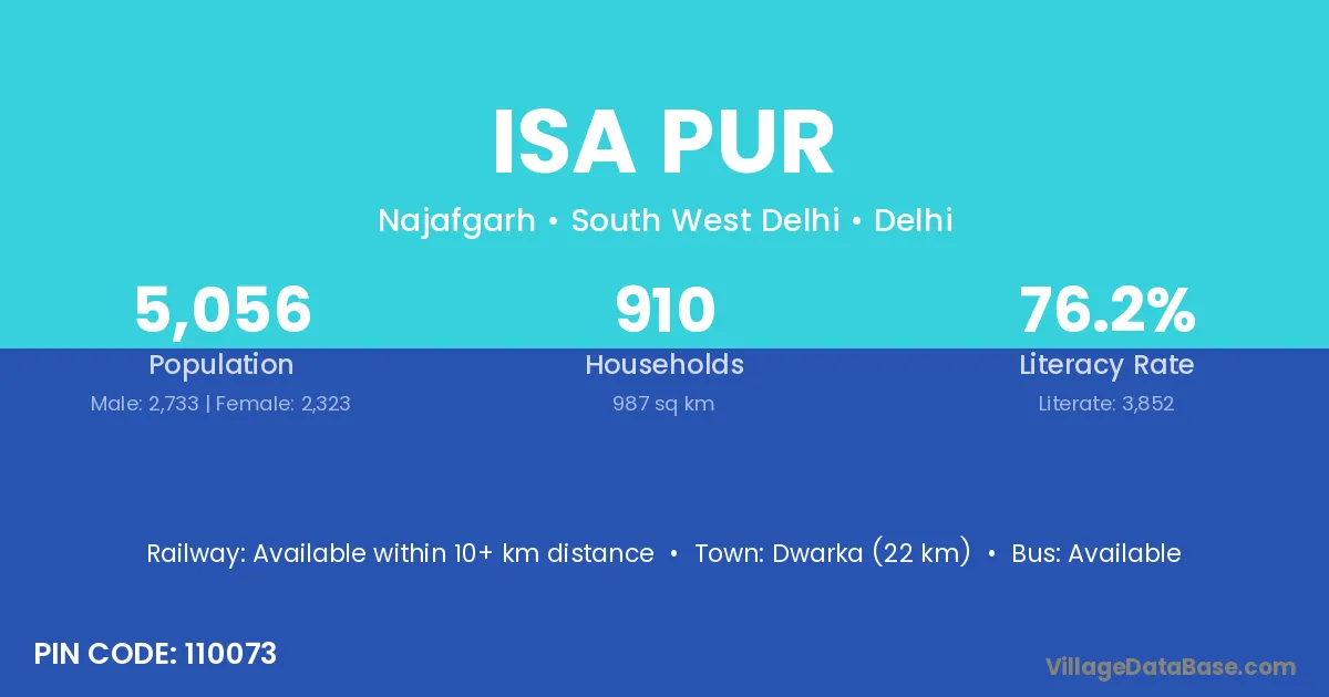 Dwarka (22 km) is the nearest town to Isa Pur village for major economic activities and is located approximately 22 km away.