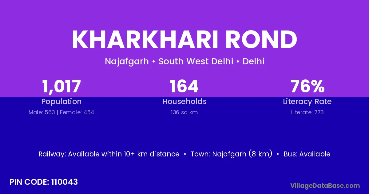 Najafgarh (8 km) is the nearest town to Kharkhari Rond village for major economic activities and is located approximately 8 km away.