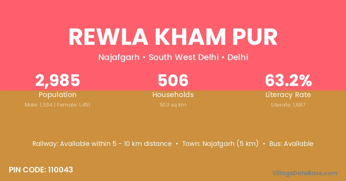 Najafgarh (5 km) is the nearest town to Rewla Kham Pur village for major economic activities and is located approximately 5 km away.