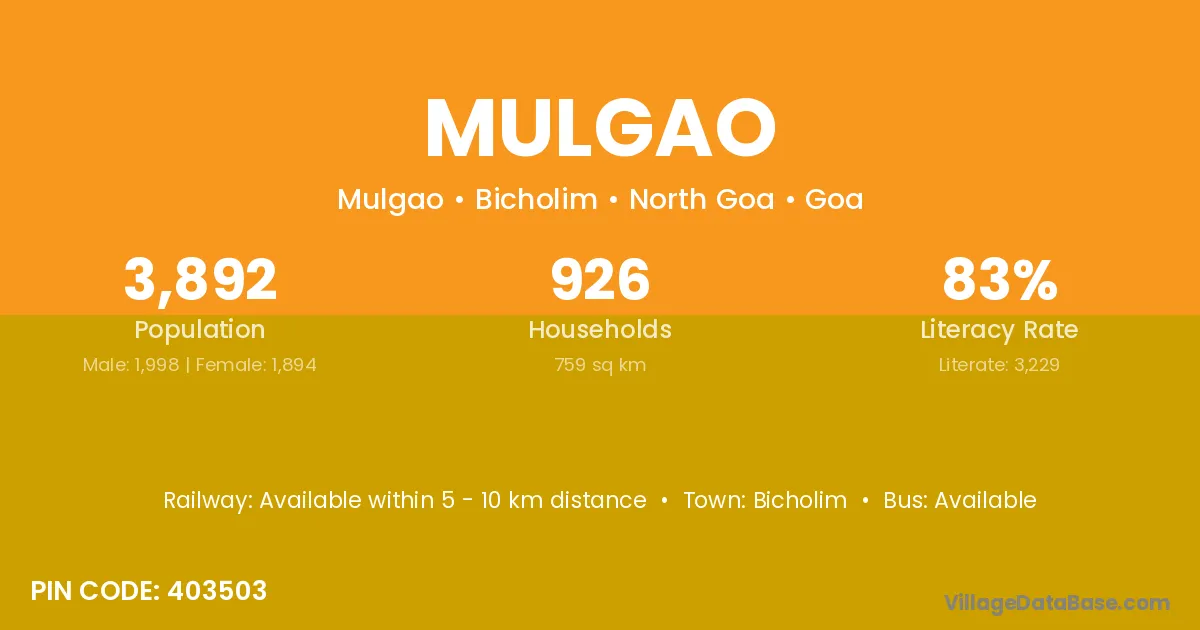 Mulgao village has a total population of 3,892 people, of which 1,998 are males and 1,894 are females.