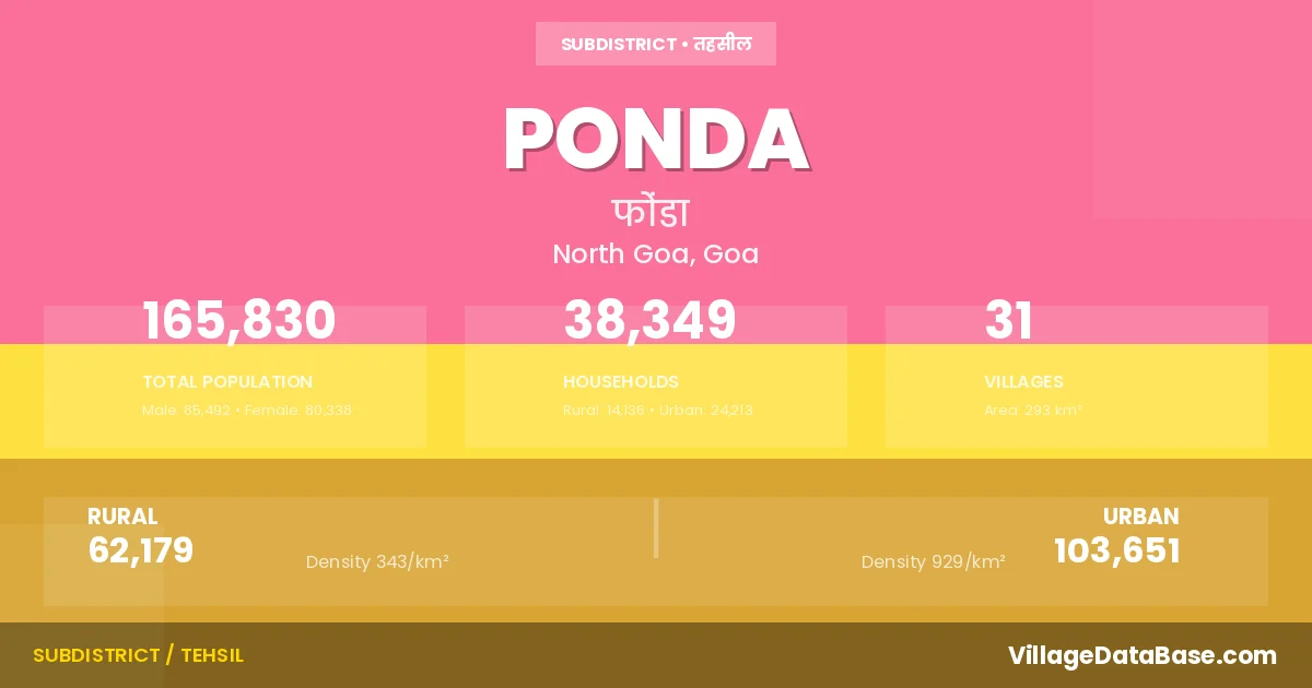 According to the 2011 census The total area of Ponda Taluka is 293 km², with a population of 165830 people. The population density is 566 inhabitants per square kilometre, and there are approximately 38349 houses in the sub district.