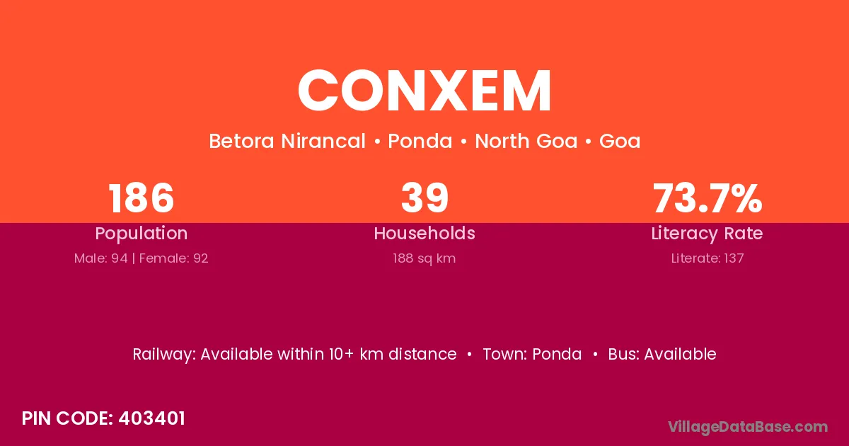 Conxem village has a total population of 186 people, of which 94 are males and 92 are females.