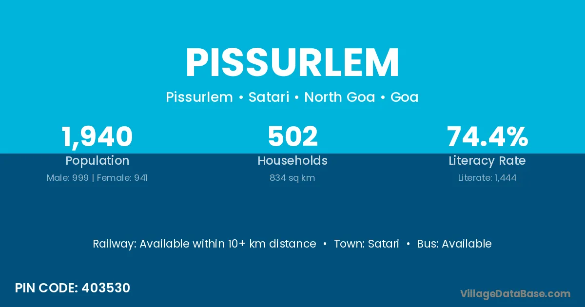 Pissurlem village has a total population of 1,940 people, of which 999 are males and 941 are females.