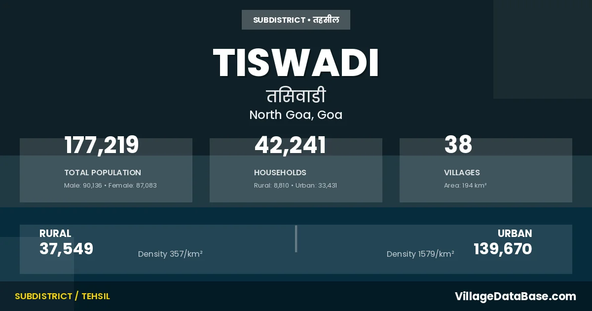 According to the 2011 census The total area of Tiswadi Taluka is 194 km², with a population of 177219 people. The population density is 915 inhabitants per square kilometre, and there are approximately 42241 houses in the sub district.