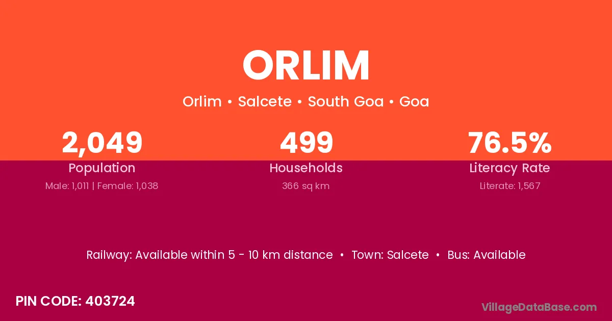 Orlim village has a total population of 2,049 people, of which 1,011 are males and 1,038 are females.