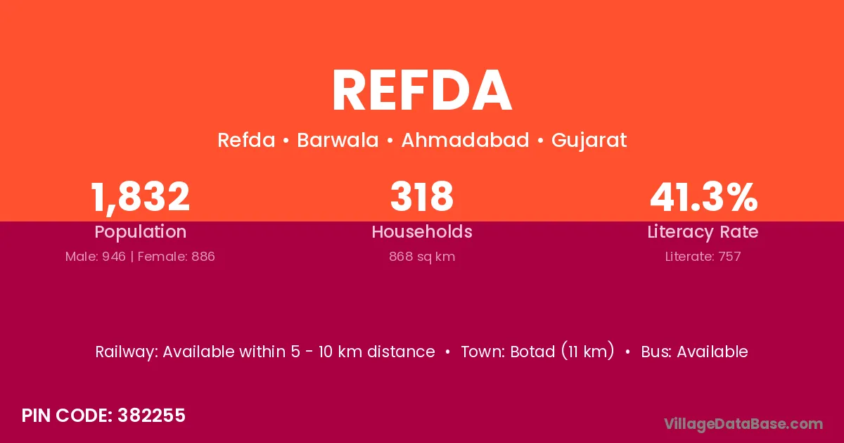 Botad (11 km) is the nearest town to Refda village for major economic activities and is located approximately 11 km away.