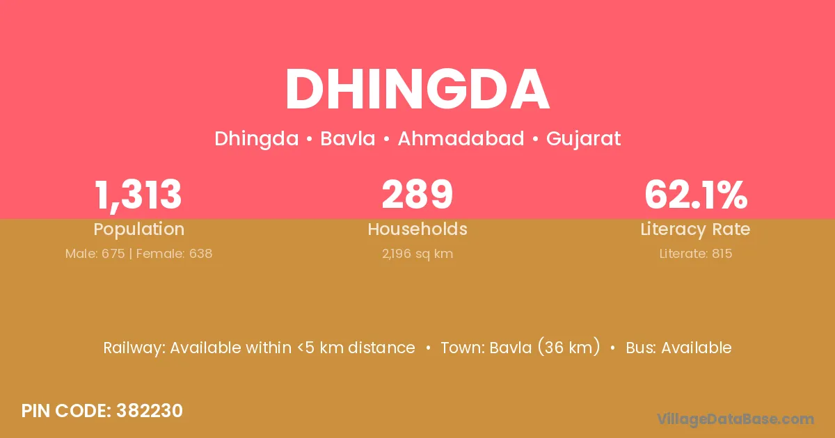 Bavla (36 km) is the nearest town to Dhingda village for major economic activities and is located approximately 36 km away.